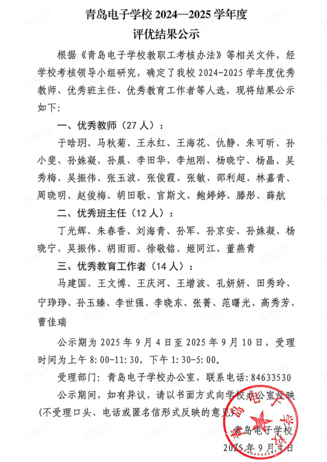 青島電子學校 2024-2025學年度評優結果公示