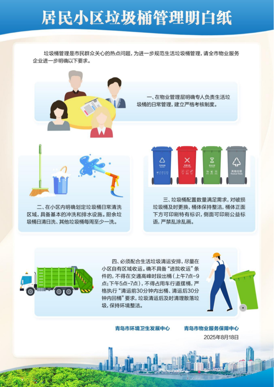 為進一步規范生活垃圾桶管理,滿足市民群眾精細化、高品質環境衛生需求,市城市管理局聚焦居民小區垃圾桶臟亂、破損、占道及收運點污染等問題,向物業服務企業及其他相關單位發放《居民小區垃圾桶管理明白紙》。通過明確管理制度、垃圾桶清洗、垃圾桶配置、垃圾桶標識、垃圾桶出回桶等方面要求和標準,推動企業建立完善長效機制,壓實管理責任,精確掌握作業標準,切實提升管理效能和精細化管理水平。