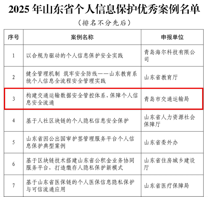 ? ? ? 近日,山東省委網(wǎng)信辦公布了2025年山東省個人信息保護優(yōu)秀案例,青島市交通運輸局的“構建交通運輸數(shù)據(jù)安全管控體系,保障個人信息安全流通”案例成功入選。