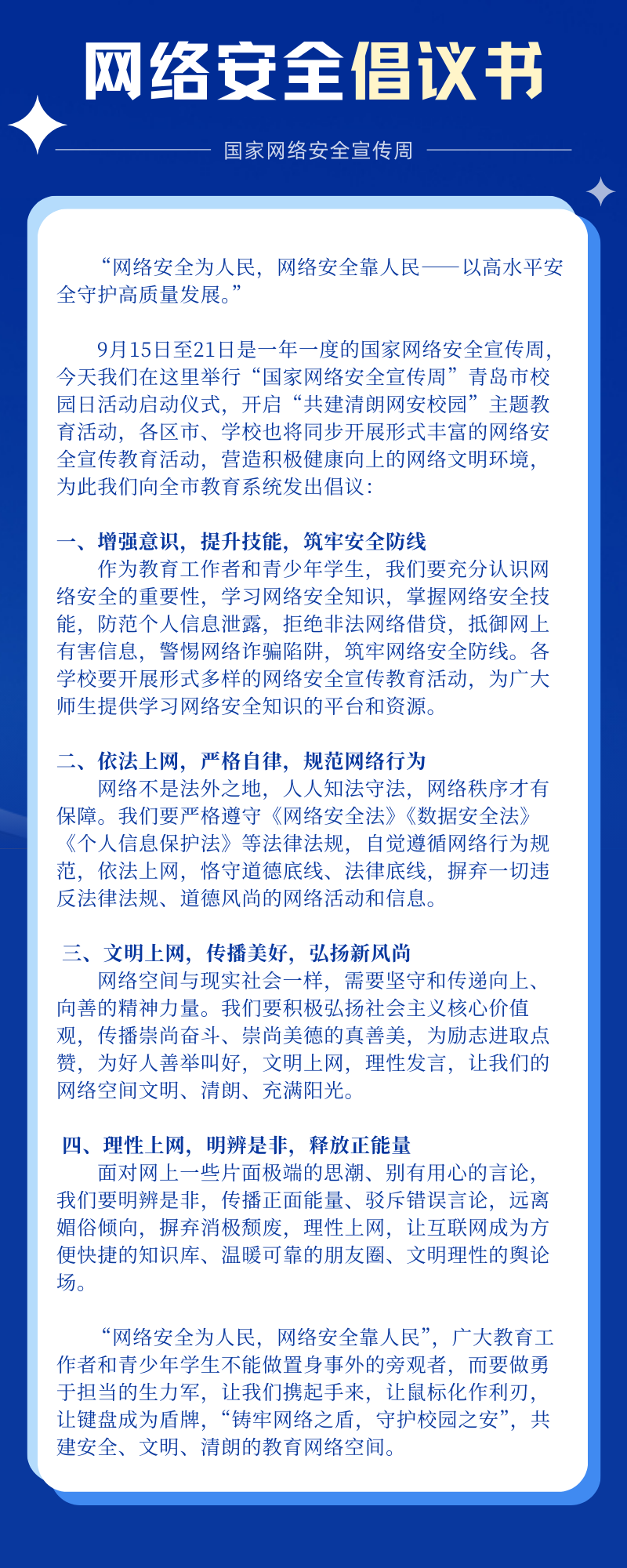 活動(dòng)期間,市教育局還發(fā)出了《網(wǎng)絡(luò)安全倡議》,號(hào)召全市各級(jí)各類學(xué)校積極開展“六個(gè)一”系列活動(dòng):觀看一堂反詐網(wǎng)絡(luò)大課,組織一場(chǎng)網(wǎng)絡(luò)安全專題活動(dòng),開展一次網(wǎng)絡(luò)安全知識(shí)宣講,進(jìn)行一次網(wǎng)絡(luò)安全風(fēng)險(xiǎn)排查,創(chuàng)作一批網(wǎng)絡(luò)安全創(chuàng)意作品,形成一批網(wǎng)絡(luò)安全數(shù)字資源,以更接地氣、更靈活的方式,開展形式多樣、貼近師生生活的網(wǎng)絡(luò)安全宣傳教育活動(dòng),吸引廣大師生積極參與、學(xué)有所獲。