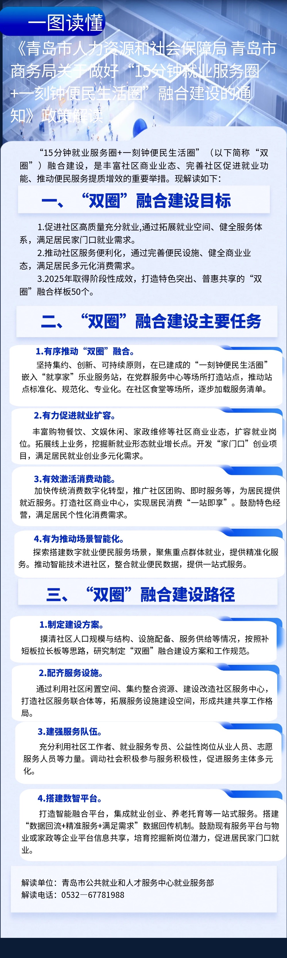 【圖片解讀】《青島市人力資源和社會(huì)保障局 青島市商務(wù)局關(guān)于做好“15分鐘就業(yè)服務(wù)圈+一刻鐘便民生活圈”融合建設(shè)的通知》政策解讀