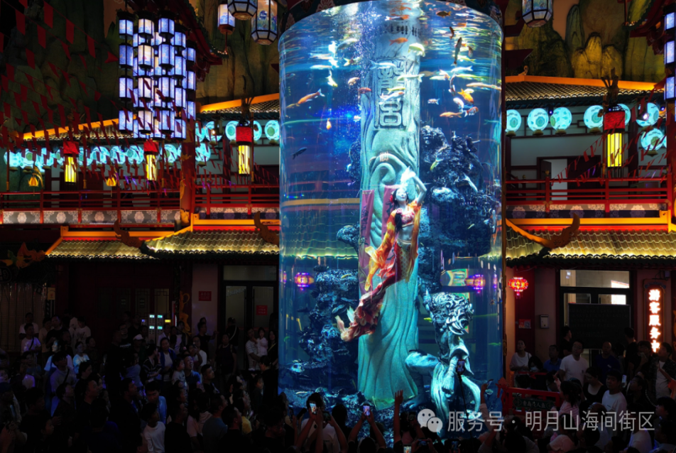 明月山海間不夜城主題街區里人潮涌動,一場場跨越“古”與“今”、融合“國”與“家”的沉浸式盛宴,讓市民游客目不暇接。不僅有《唐宮夜宴》《一夢驚鴻》等國風經典帶來傳統美學的共鳴,在中央電音廣場東北側,月映山海煙花秀以絢麗的煙花,將節日的浪漫氛圍推向高潮。