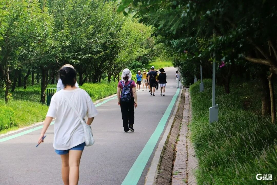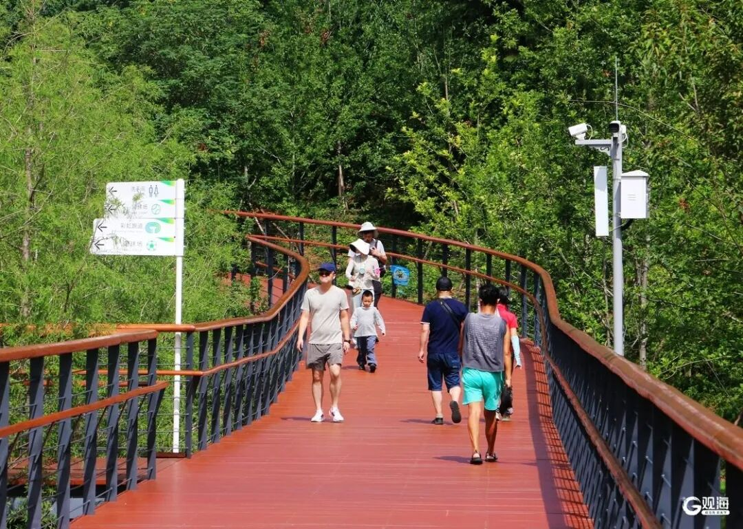 蜿蜒的木棧道依山而建,行人緩步而上,腳下木板輕響,抬頭便是層疊綠蔭;綠道上,有人騎著單車穿梭,衣角被風(fēng)掀起,笑聲落滿林間;草坪空地上,孩子們嬉鬧奔跑,幾頂帳篷搭在其間,親朋好友們閑談暢聊;不遠(yuǎn)處游樂場里,滿是孩子的雀躍呼喊,家長們坐在長椅上,笑著看孩子撒歡。