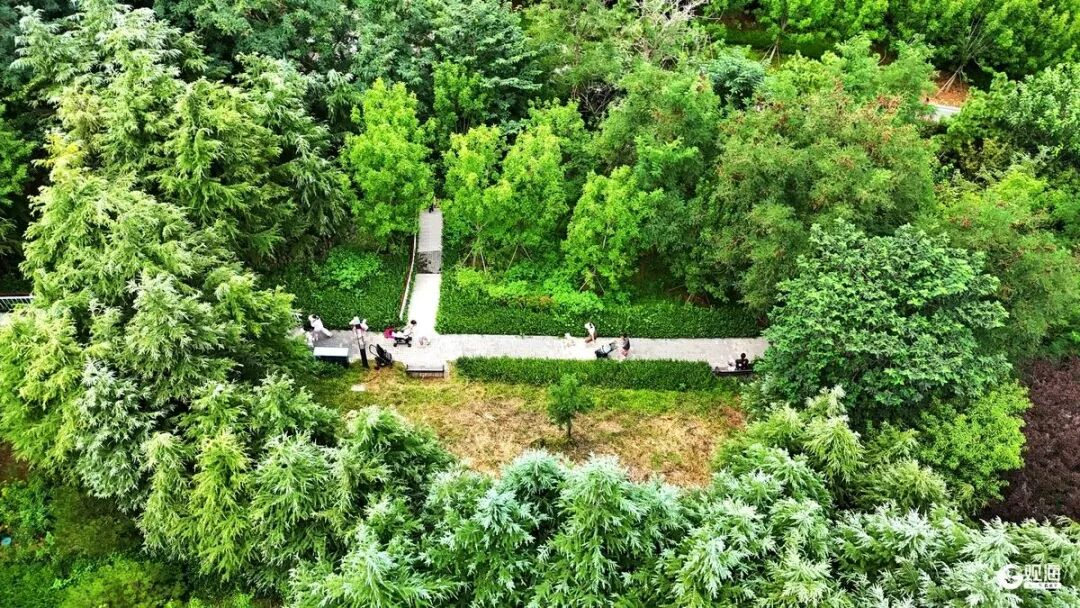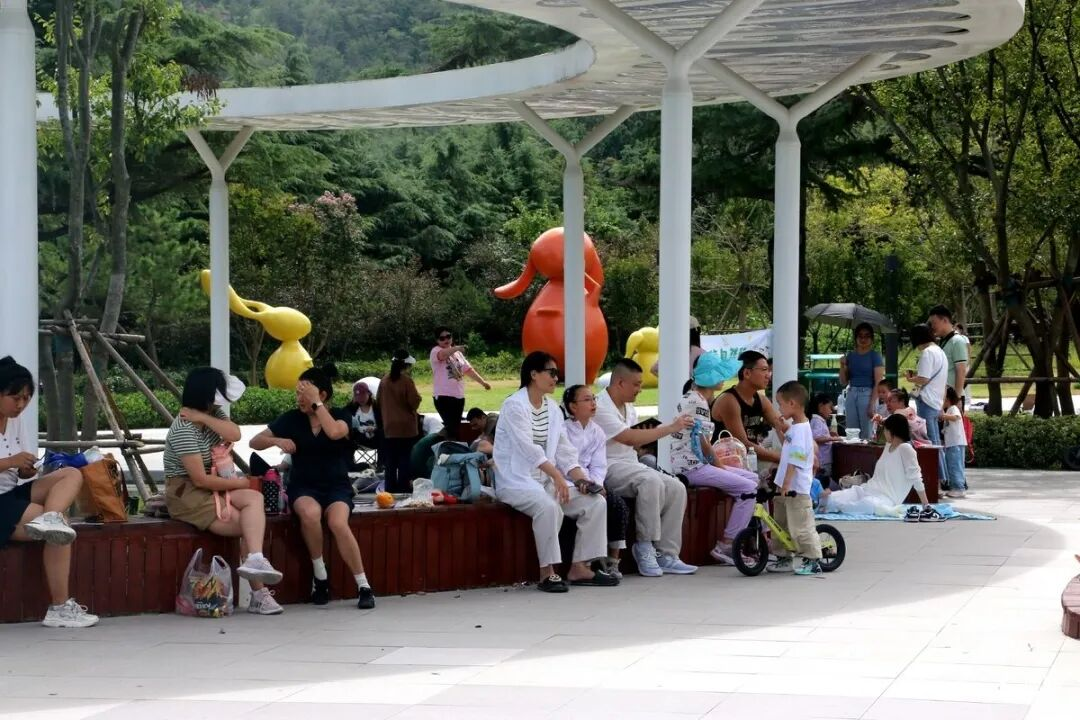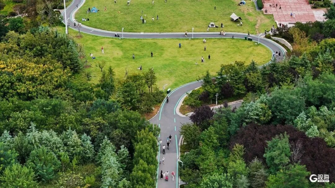 蜿蜒的木棧道依山而建,行人緩步而上,腳下木板輕響,抬頭便是層疊綠蔭;綠道上,有人騎著單車穿梭,衣角被風掀起,笑聲落滿林間;草坪空地上,孩子們嬉鬧奔跑,幾頂帳篷搭在其間,親朋好友們閑談暢聊;不遠處游樂場里,滿是孩子的雀躍呼喊,家長們坐在長椅上,笑著看孩子撒歡。