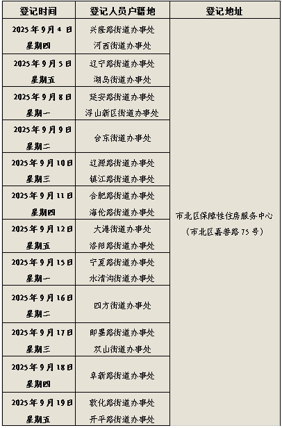 2.為避免人員聚集,保障現場登記秩序,方便申請人登記,本次配租登記以街道辦事處為單位實行錯時分散登記。具體登記時間:上午9:00—11:30,下午2:00—5:00。具體登記日期、地點如下: